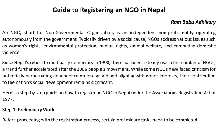 All INGOs in Nepal operate under general and project-specific agreements with the Social Welfare Council.