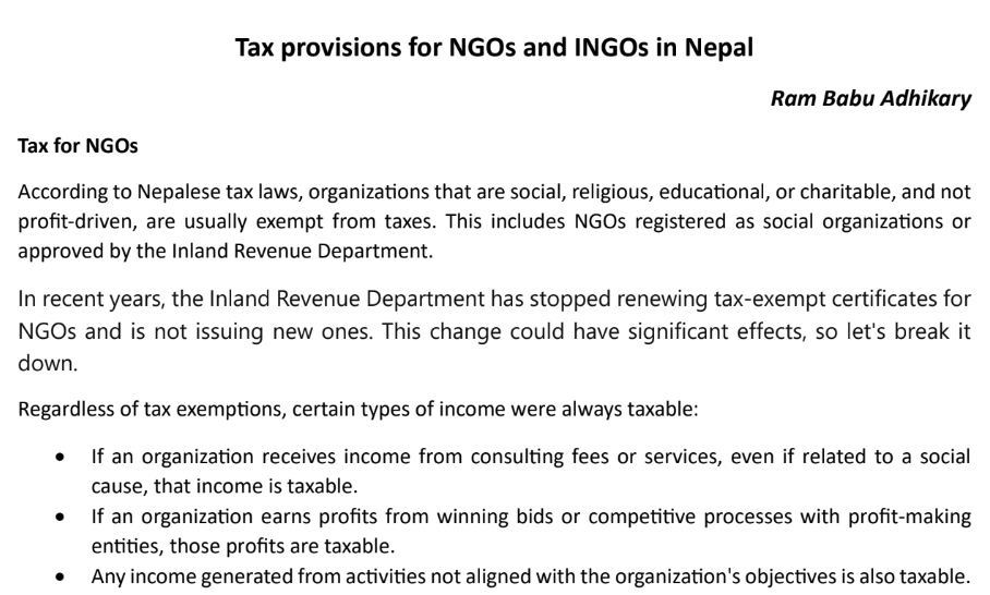 tax is only levied when income is generated. INGOs in Nepal typically don't generate their own income;